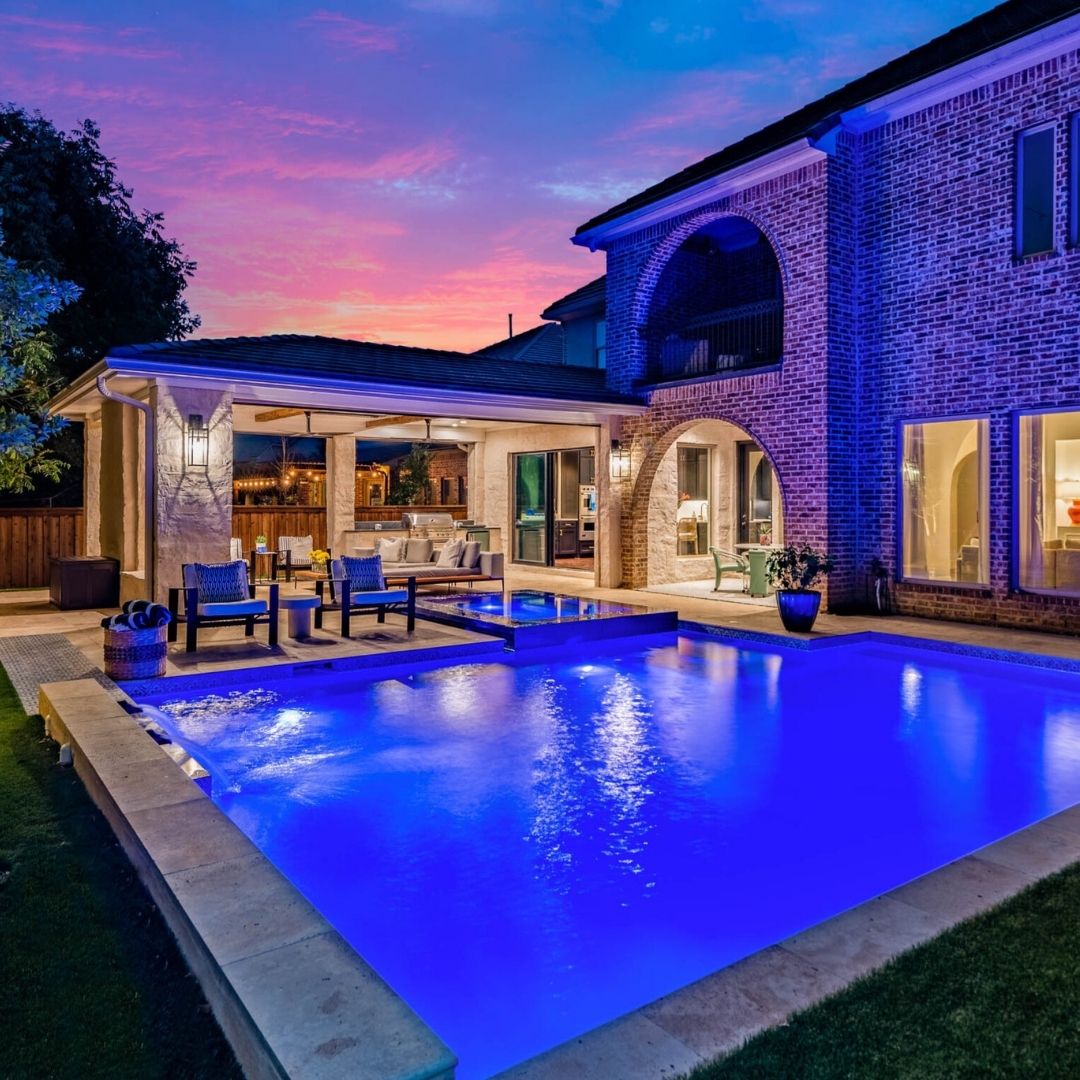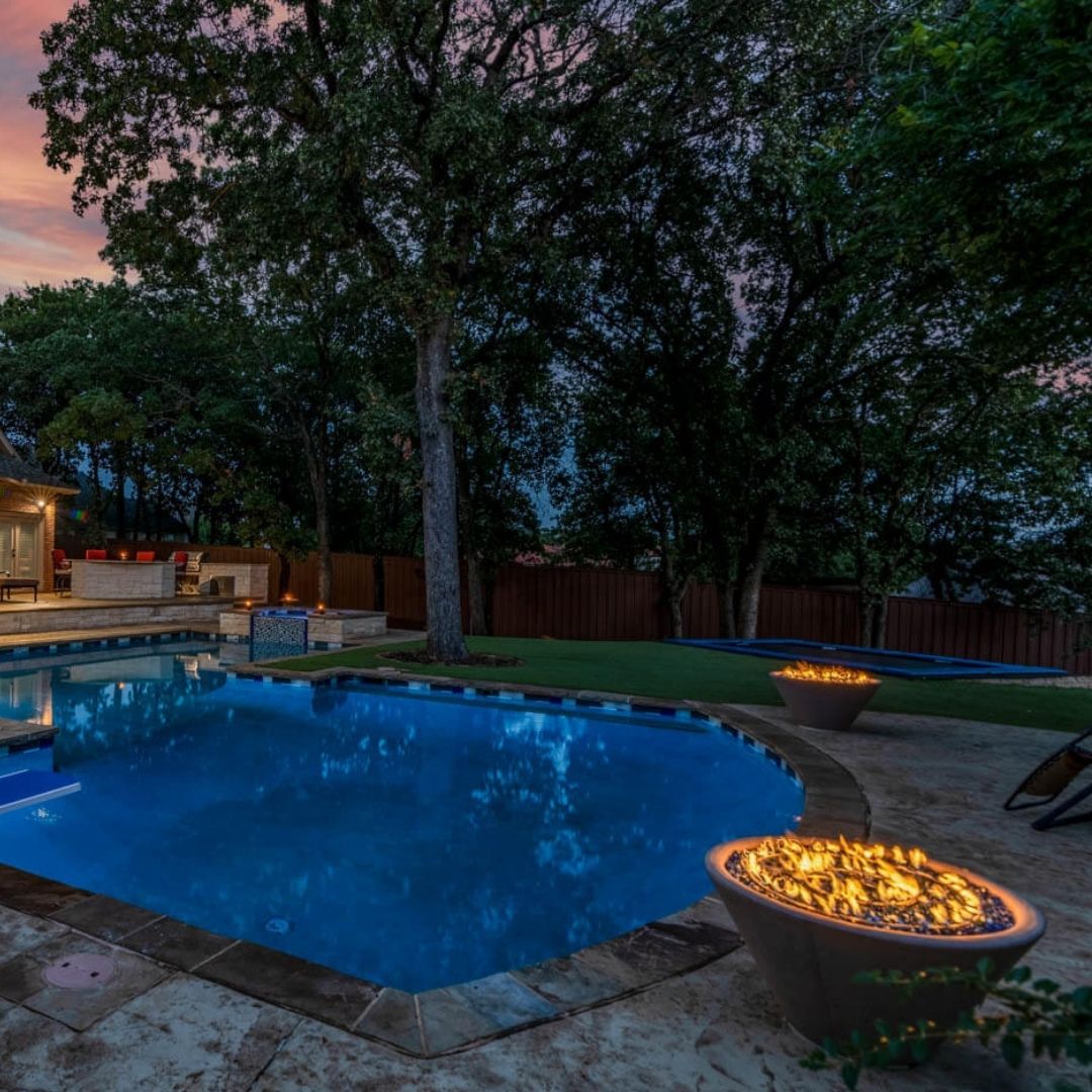 True luxury lies in the juxtaposition of elements. By placing custom fire pits adjacent to your water features, you create a dramatic focal point that captivates the senses. The flickering orange flames reflecting off the cool blue water provide a sophisticated, resort-style ambiance that keeps your outdoor space usable and beautiful long after the Texas sun goes down.