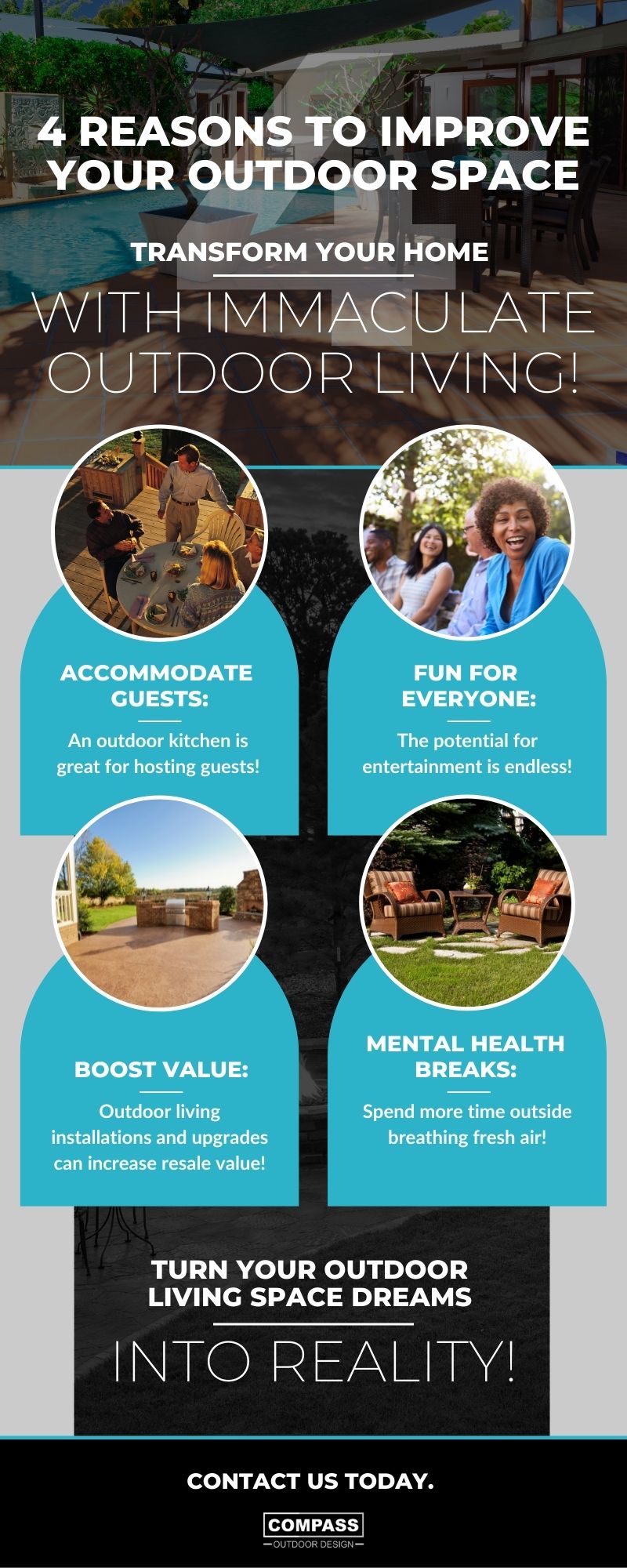 By upgrading the exterior of your home, you can create a space that is perfect for entertaining or relaxing in any season. With our installation services, the Compass team can transform your Dallas and Fort Worth space into an outdoor living area that can match any mood. Contact us today to get started!