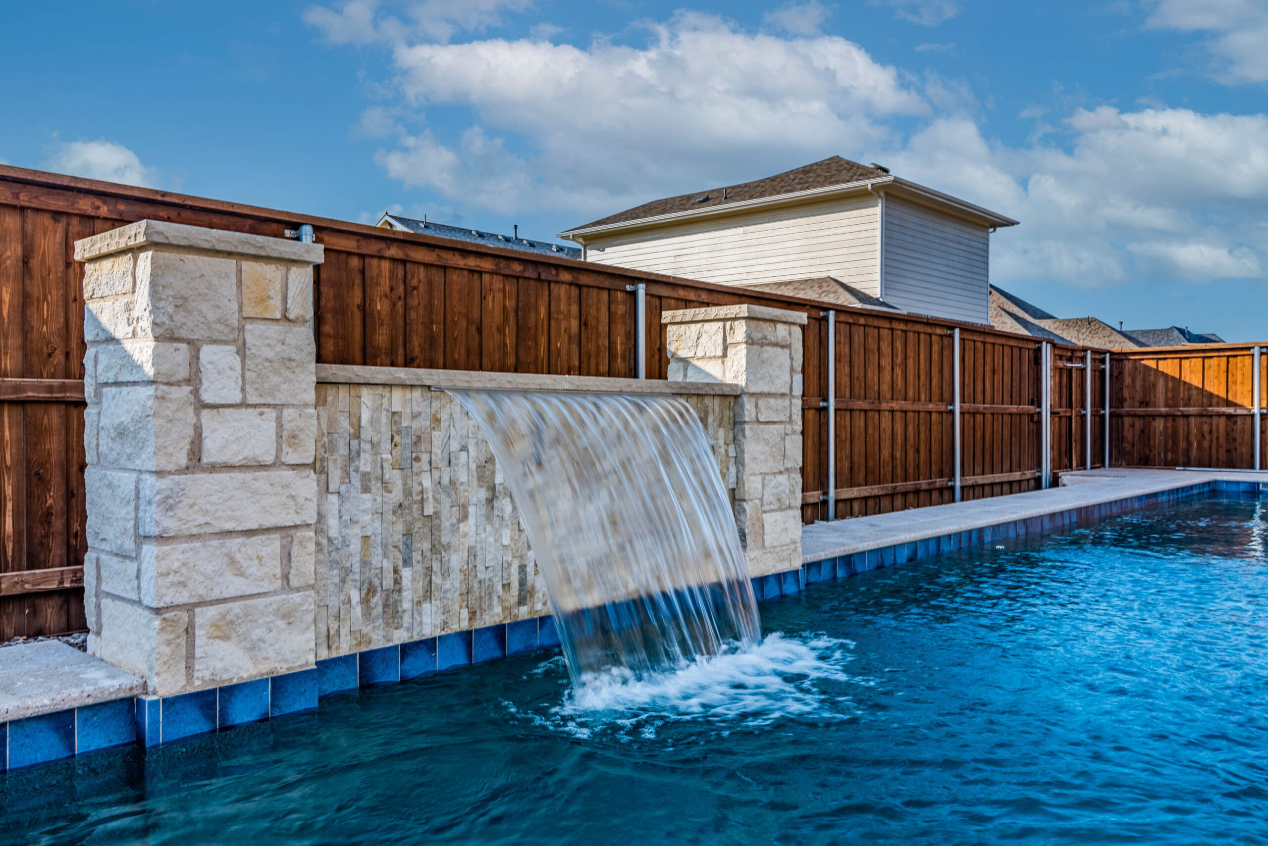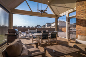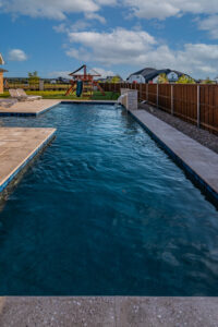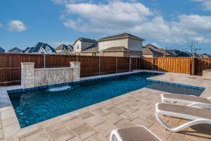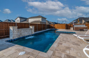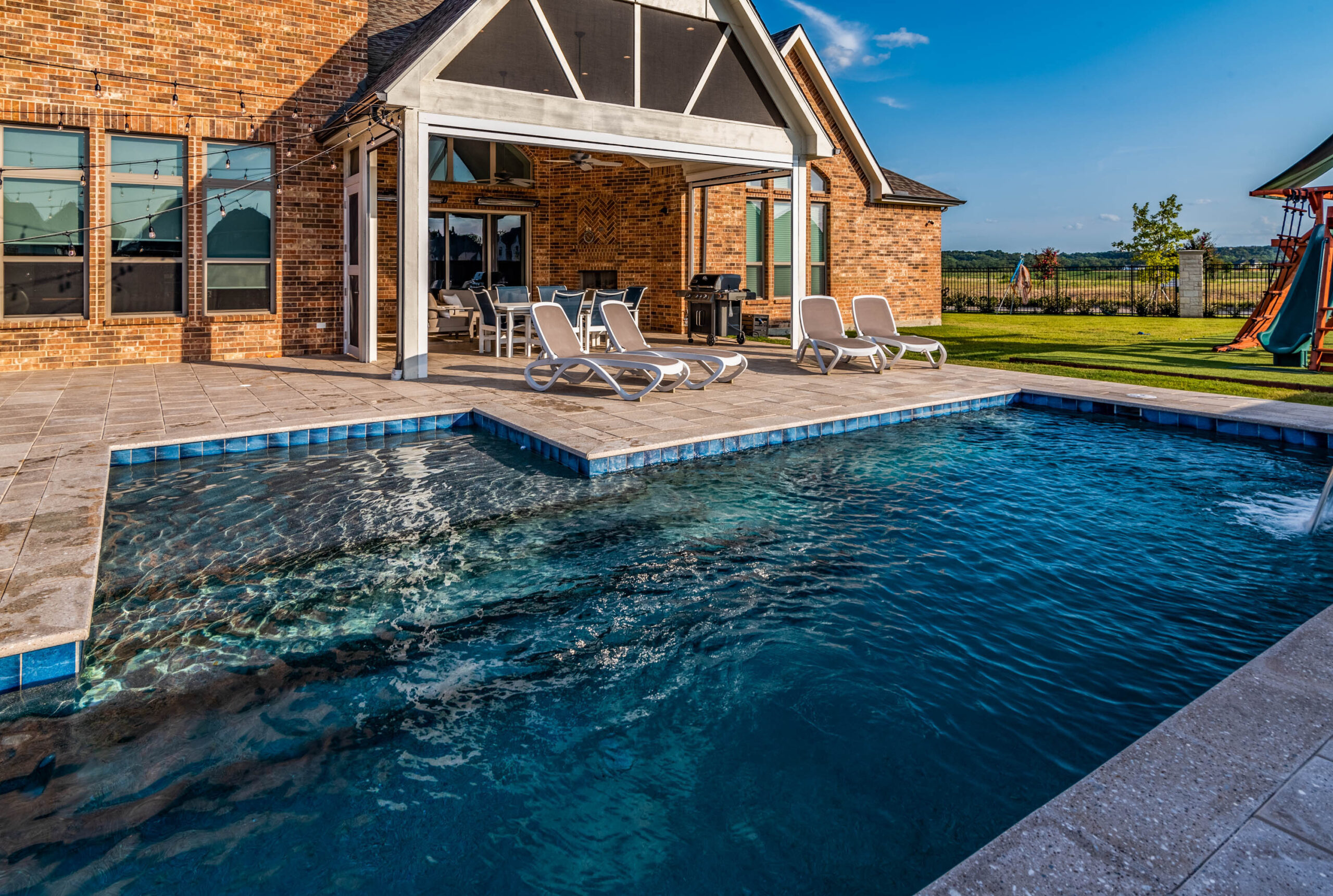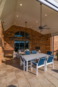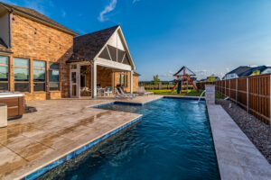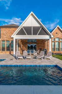 These clients asked us to come in immediately following the closing on their new home. Having previously had pools at their home, they knew exactly what they wanted. We installed a pool set up for exercise and lap swimming. It still allowed the kids plenty of area to play and splash around in the summer. We installed a pre-fabricated hot tub to help with muscle recovery. The patio roof line was extended and we installed motorized screens on two sides with a screen door for access in and out of the space. The area in the gable has mesh screening installed permanently to keep the bugs out of the space. We also added electric heaters to the space to give them comfort in the winter and allow them to utilize the space year round.