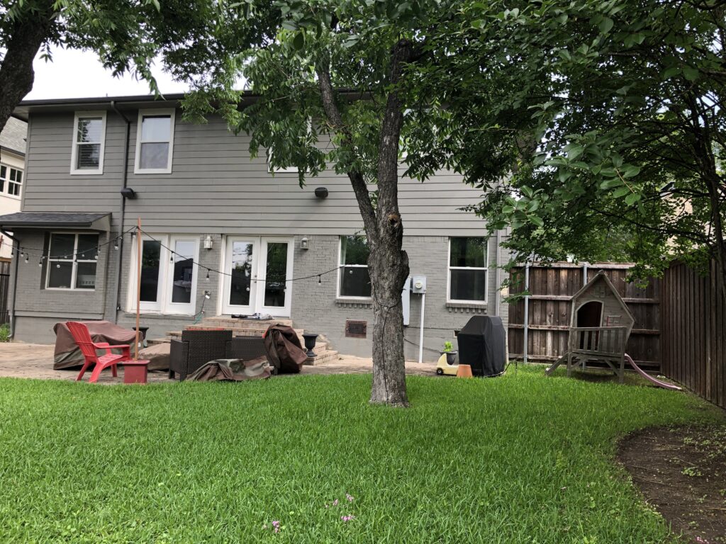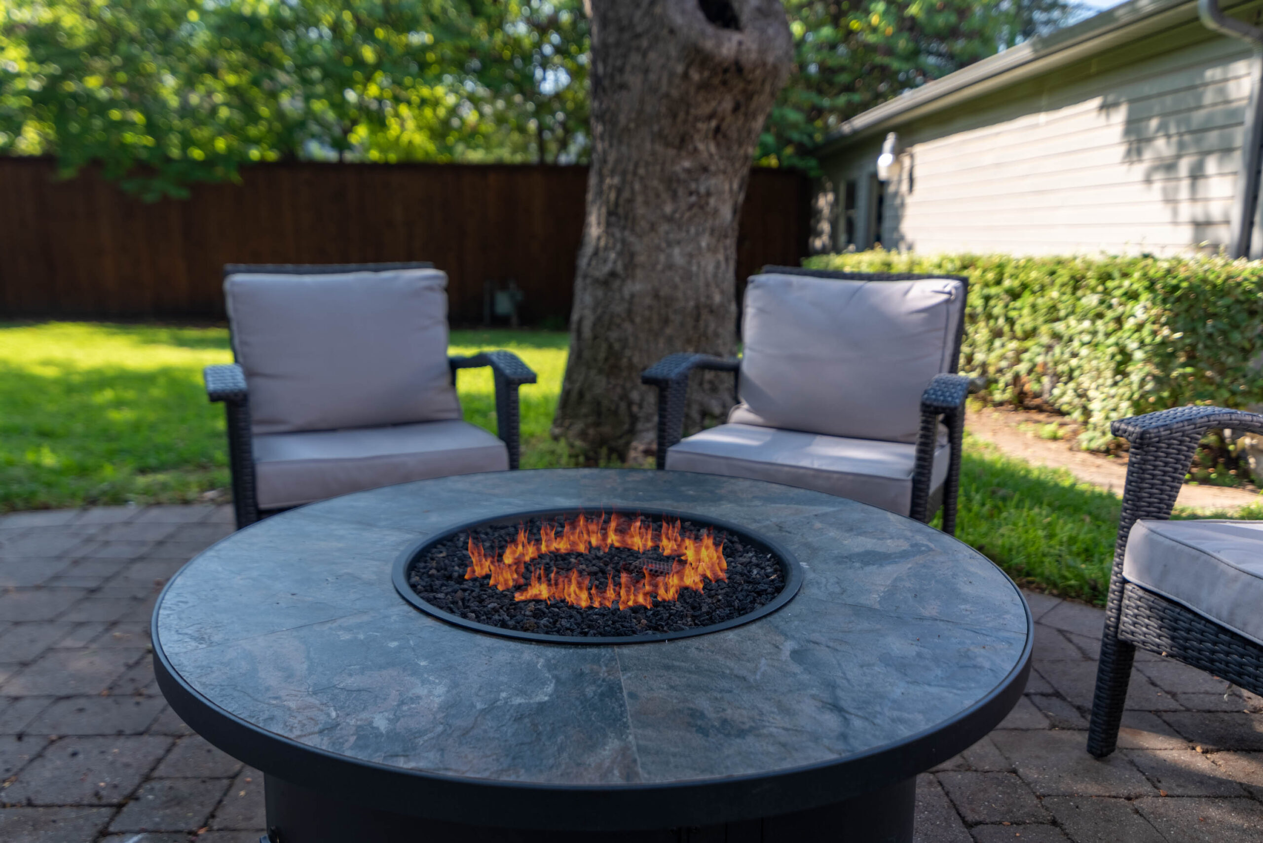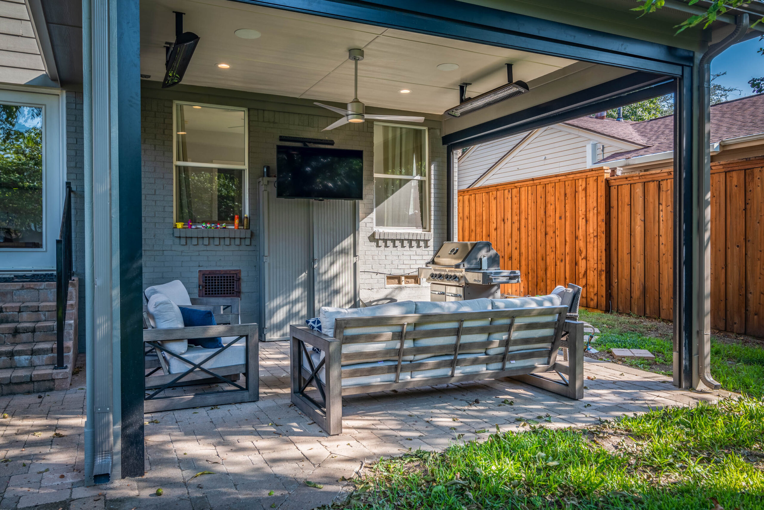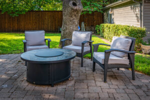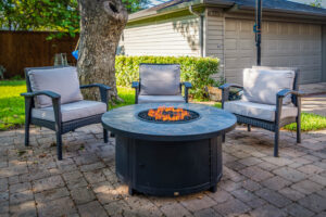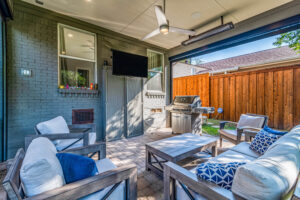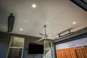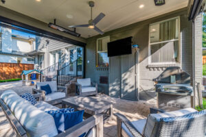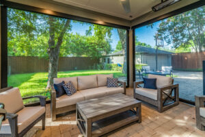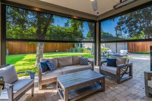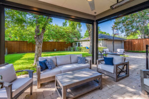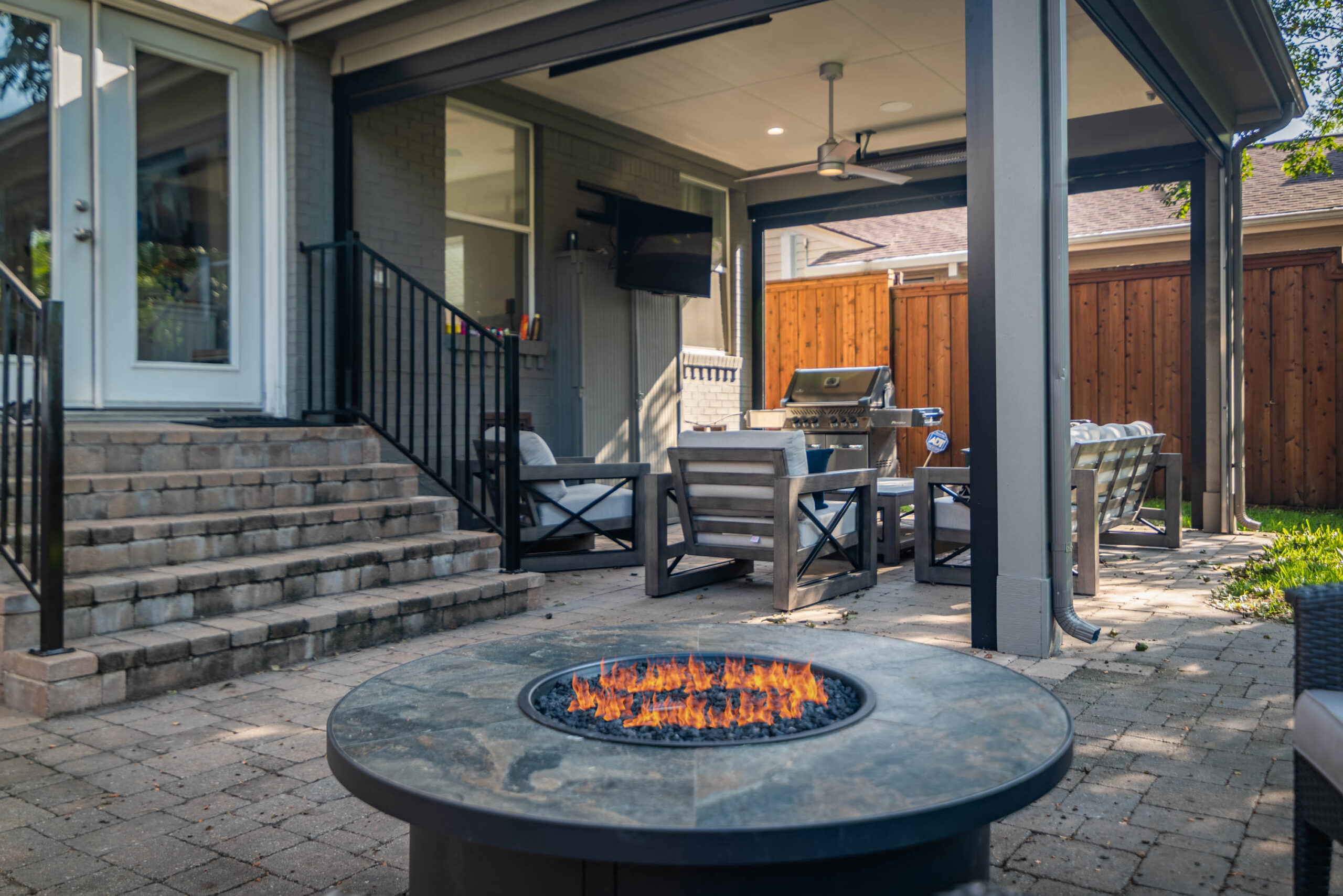 The homeowners needed shade if they were going to enjoy watching their kids in the backyard. We extened their flooring with matching pavers and added a hip roof patio cover. The ceiling is a flat ceiling at a 10’ height with painted 4×8 fiber cement. Motorized screens, electric heaters, recessed cans and a ceiling fan were installed to creat the full outdoor living experience along with a TV. We also installed a fire pit table for the clients along with a gas line for easy access to turn on and off and enjoy on the cooler days.