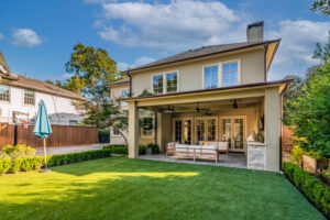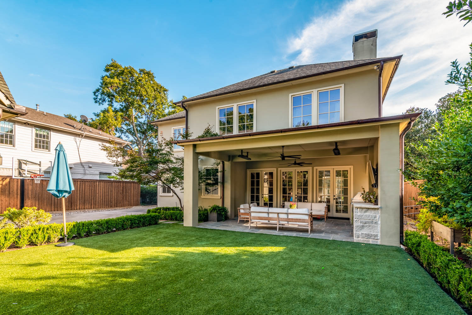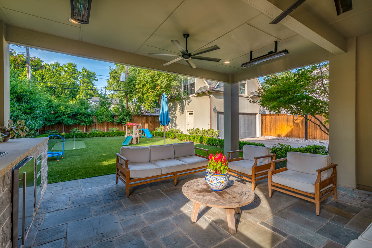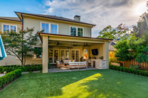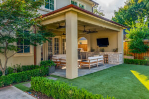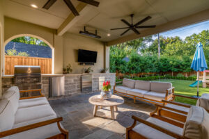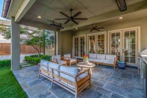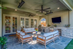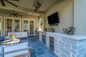 The homeowners needed a larger patio space to entertain and grill. We extended the patio flooring with Pennsylvania Blue flagstone, a new hip roof line with flat ceiling, recessed cans and fans. The west wall has stucco to tie in to the existing architecture. Below we extended the existing cooking area to allow for more storage, counter space and a kegerator.