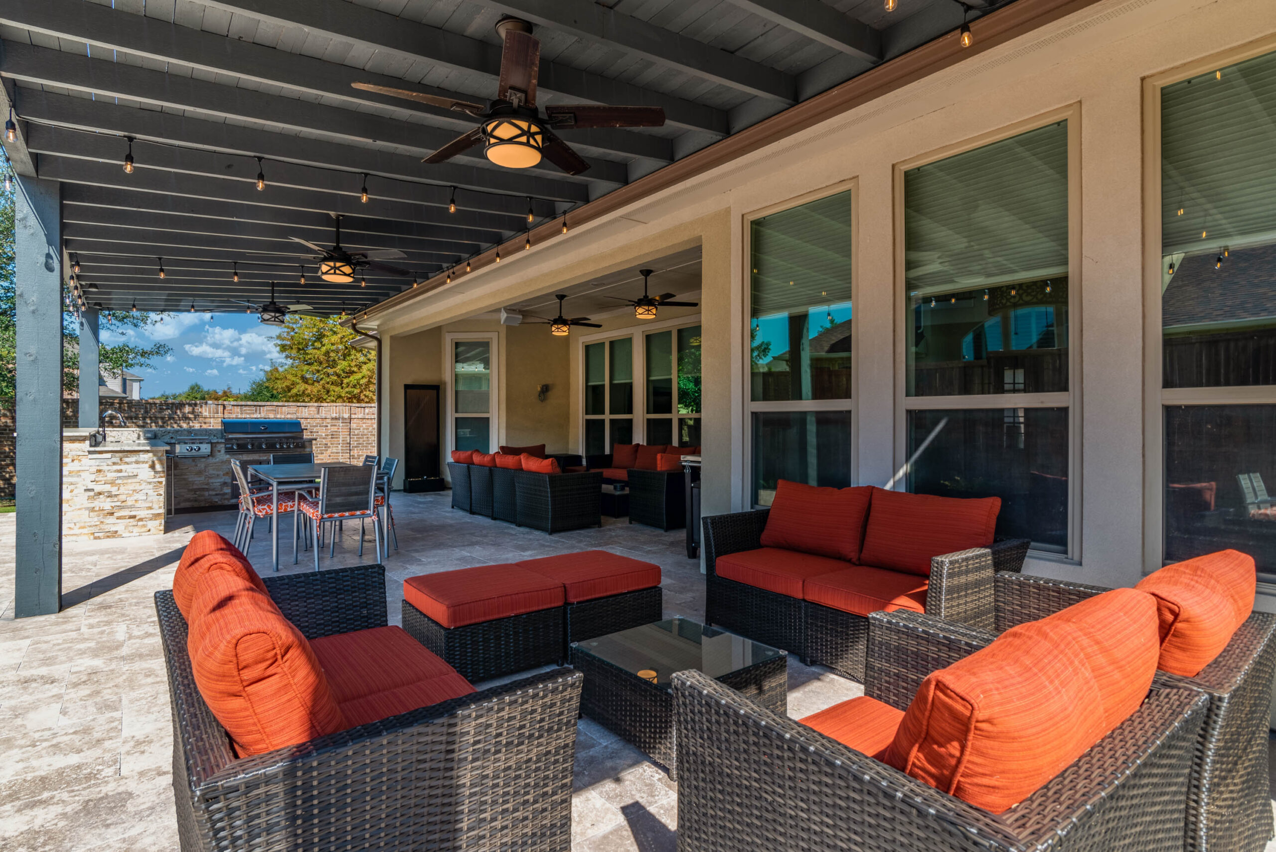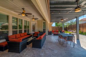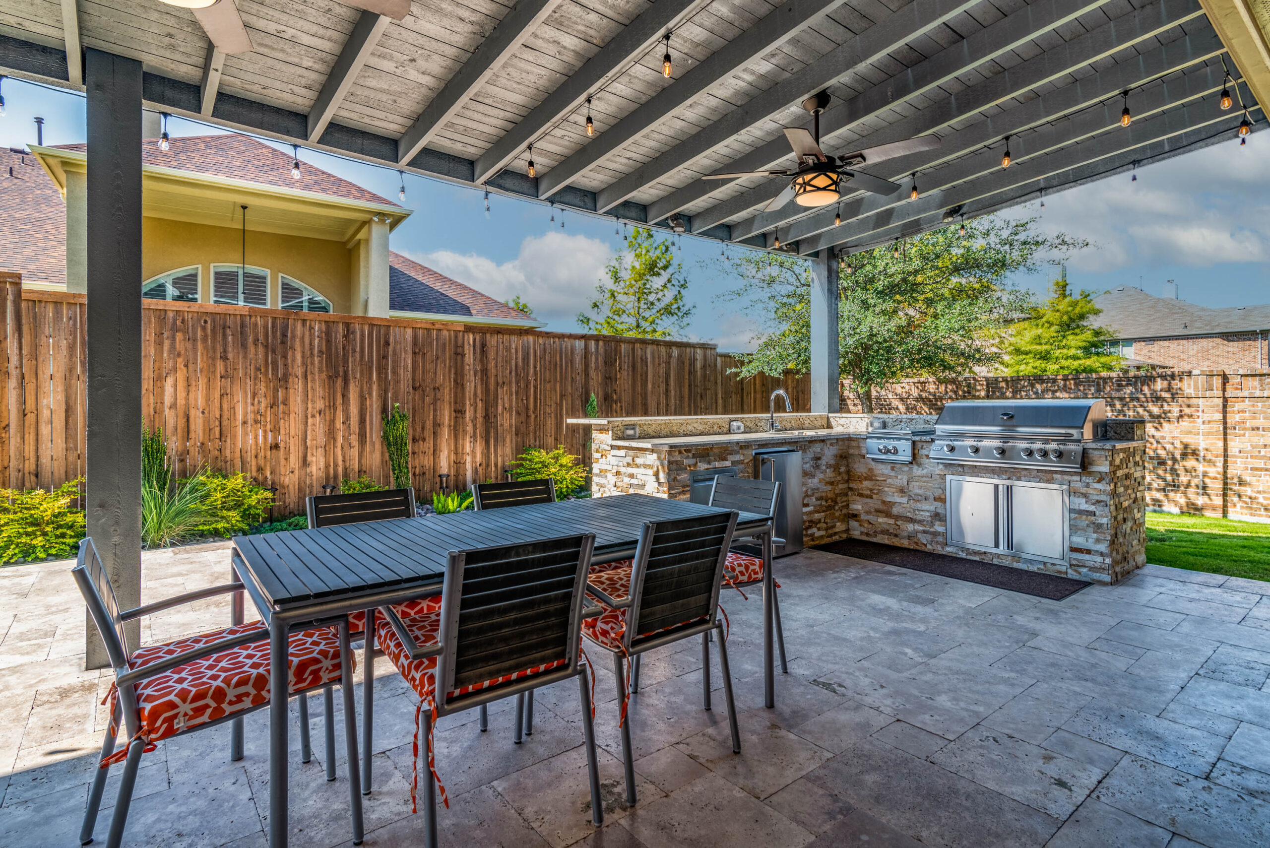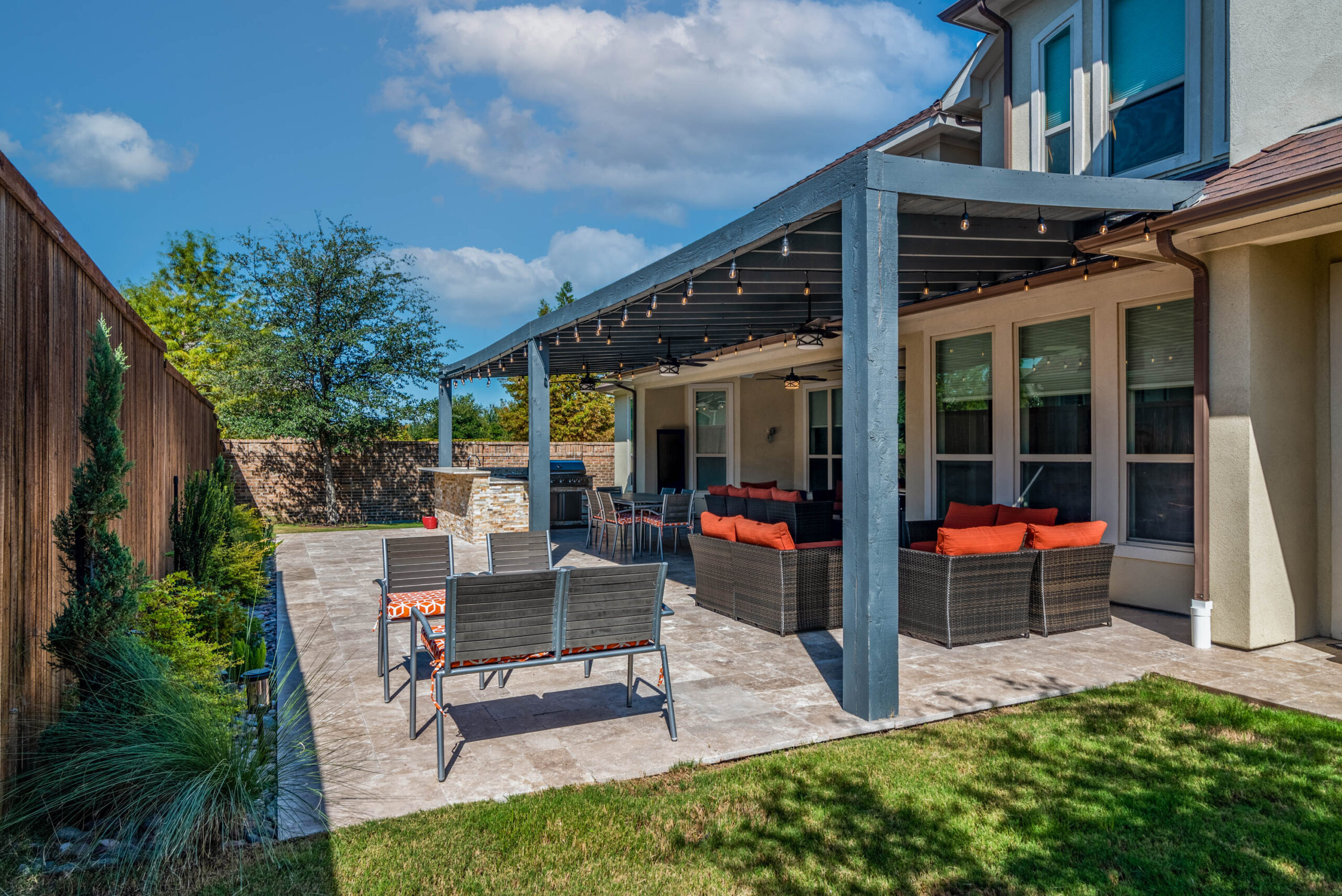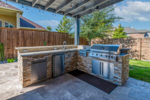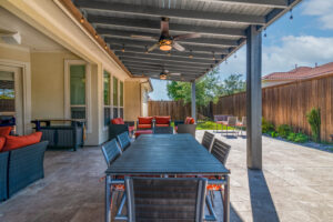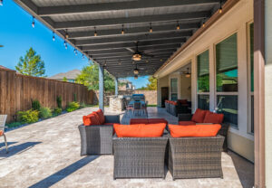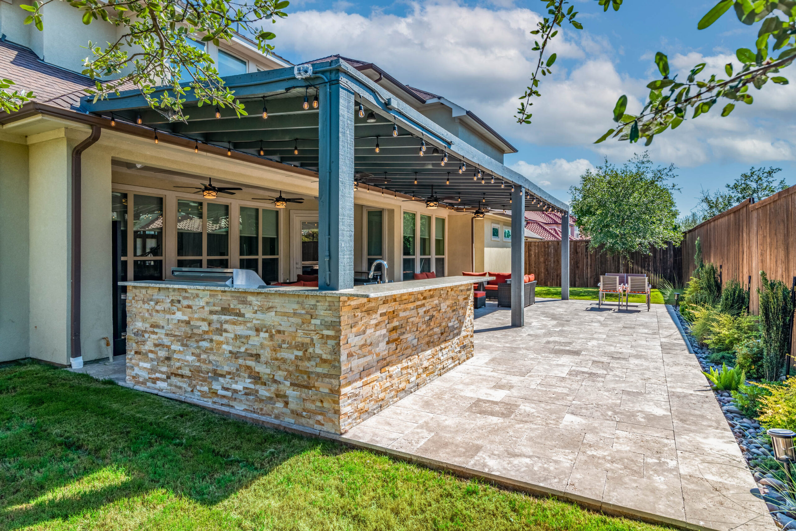 The cooking area is approximately 20’ in length and contains a grill, double side burner, sink, fridge, and trash drawer. The patio cover spans roughly 14’ beyond the home and 30’ across, with landscaping at the rear fence line at the end of the project to bring in some natural color.