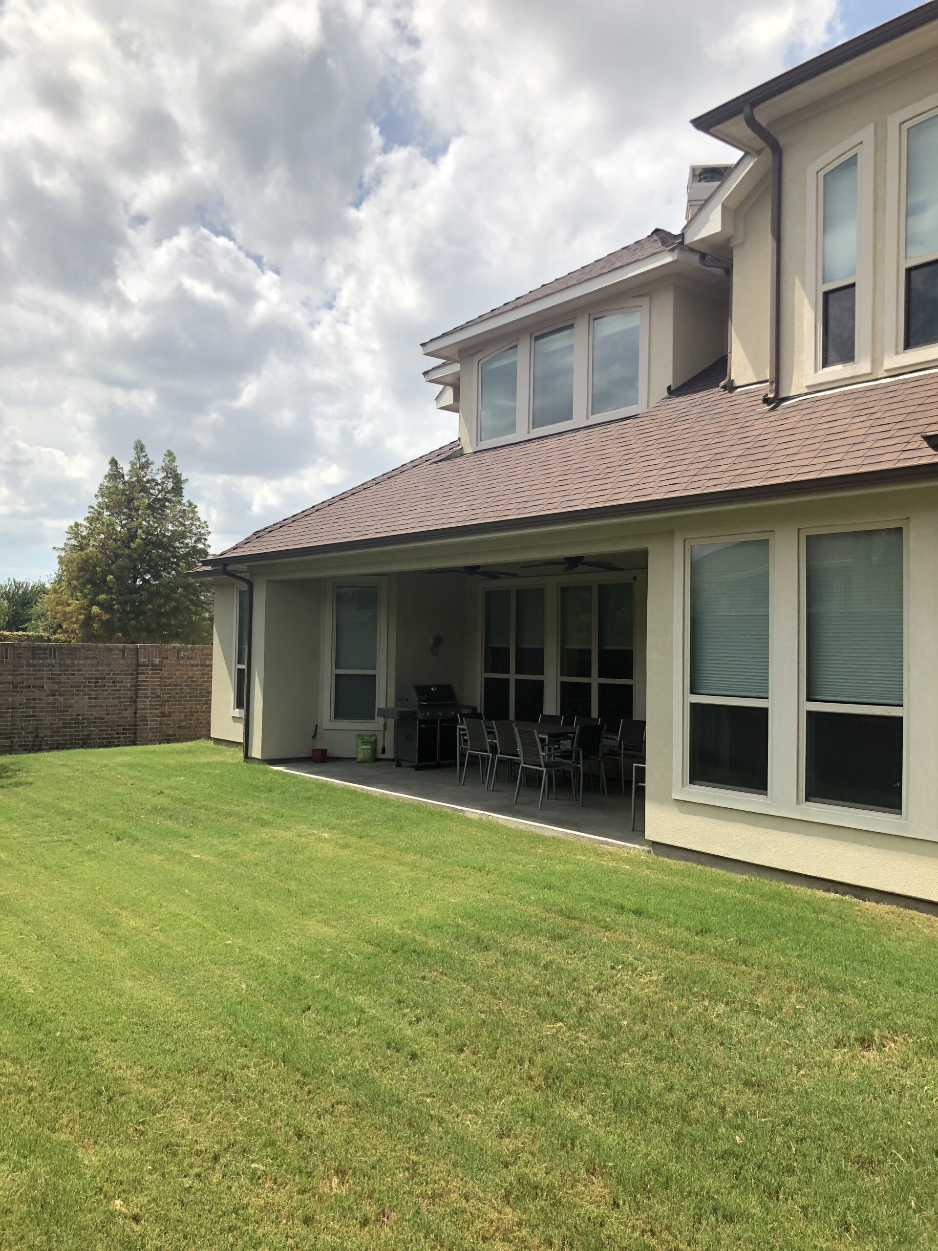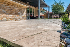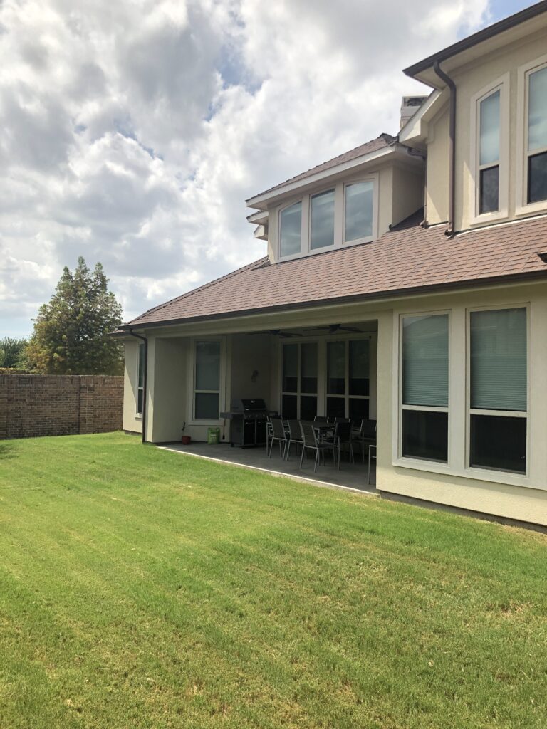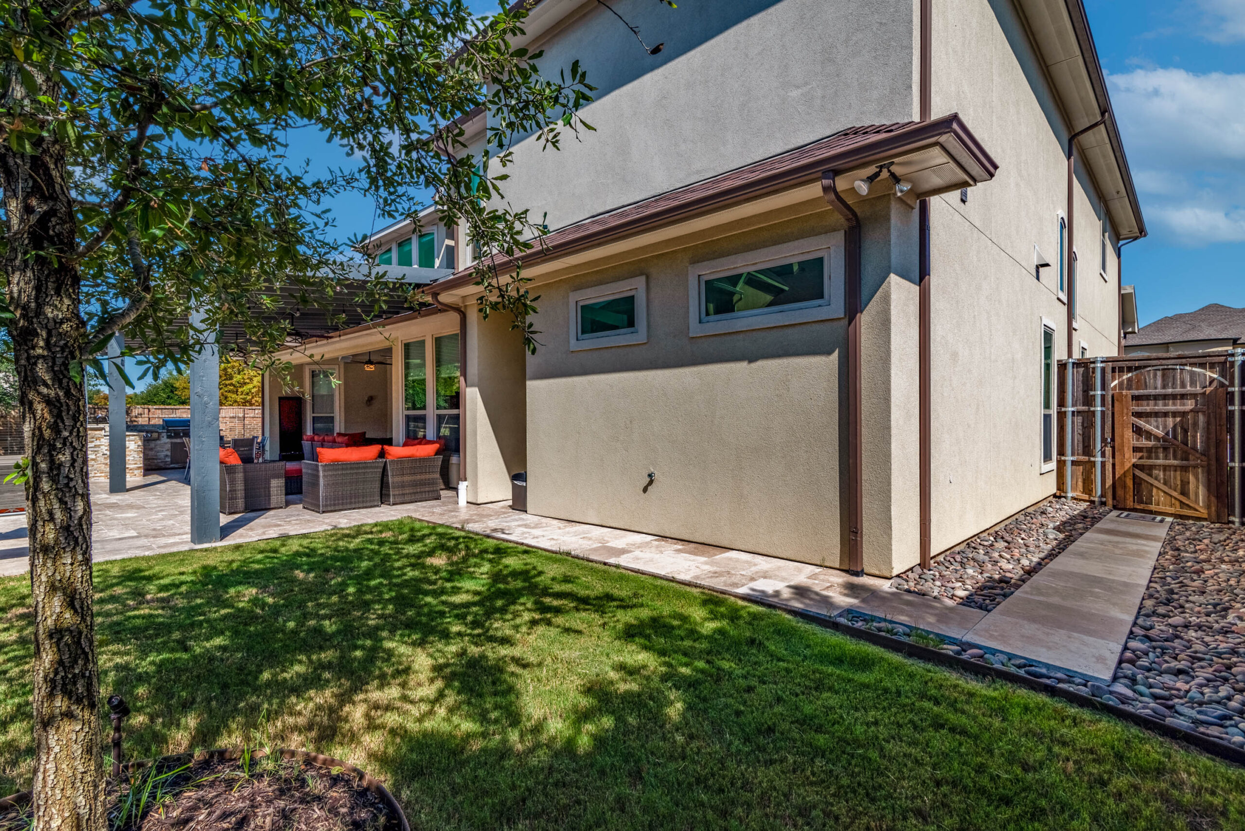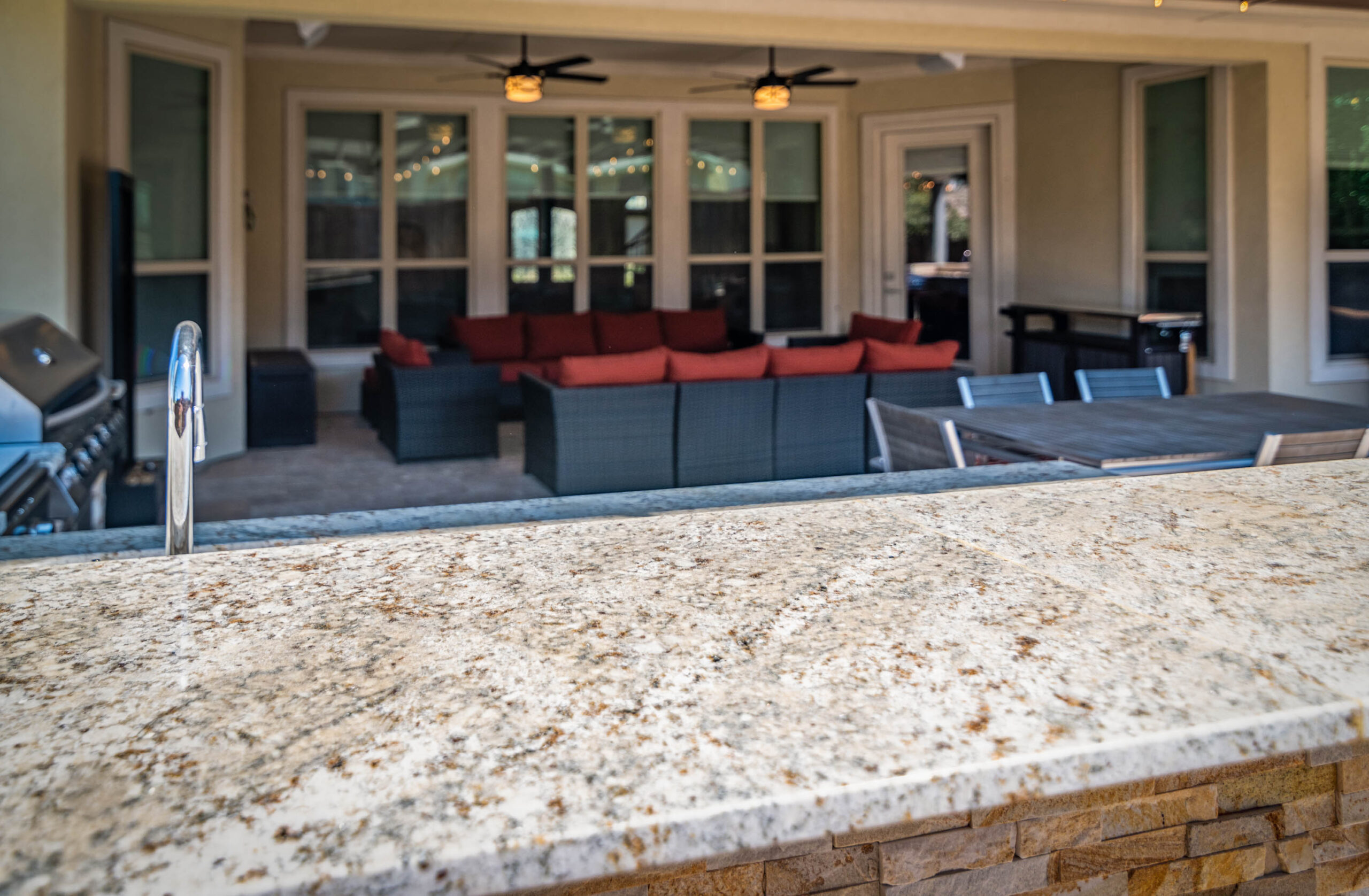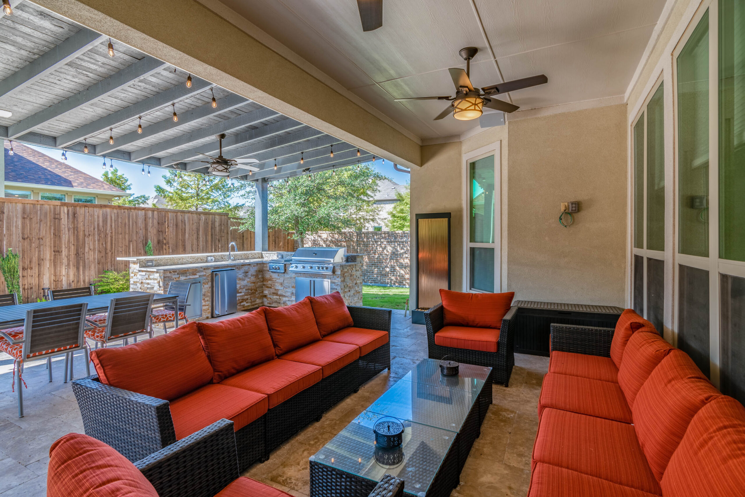 The cooking area is approximately 20’ in length and contains a grill, double side burner, sink, fridge, and trash drawer. The patio cover spans roughly 14’ beyond the home and 30’ across, with landscaping at the rear fence line at the end of the project to bring in some natural color.