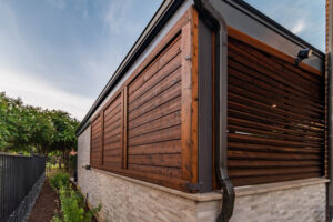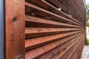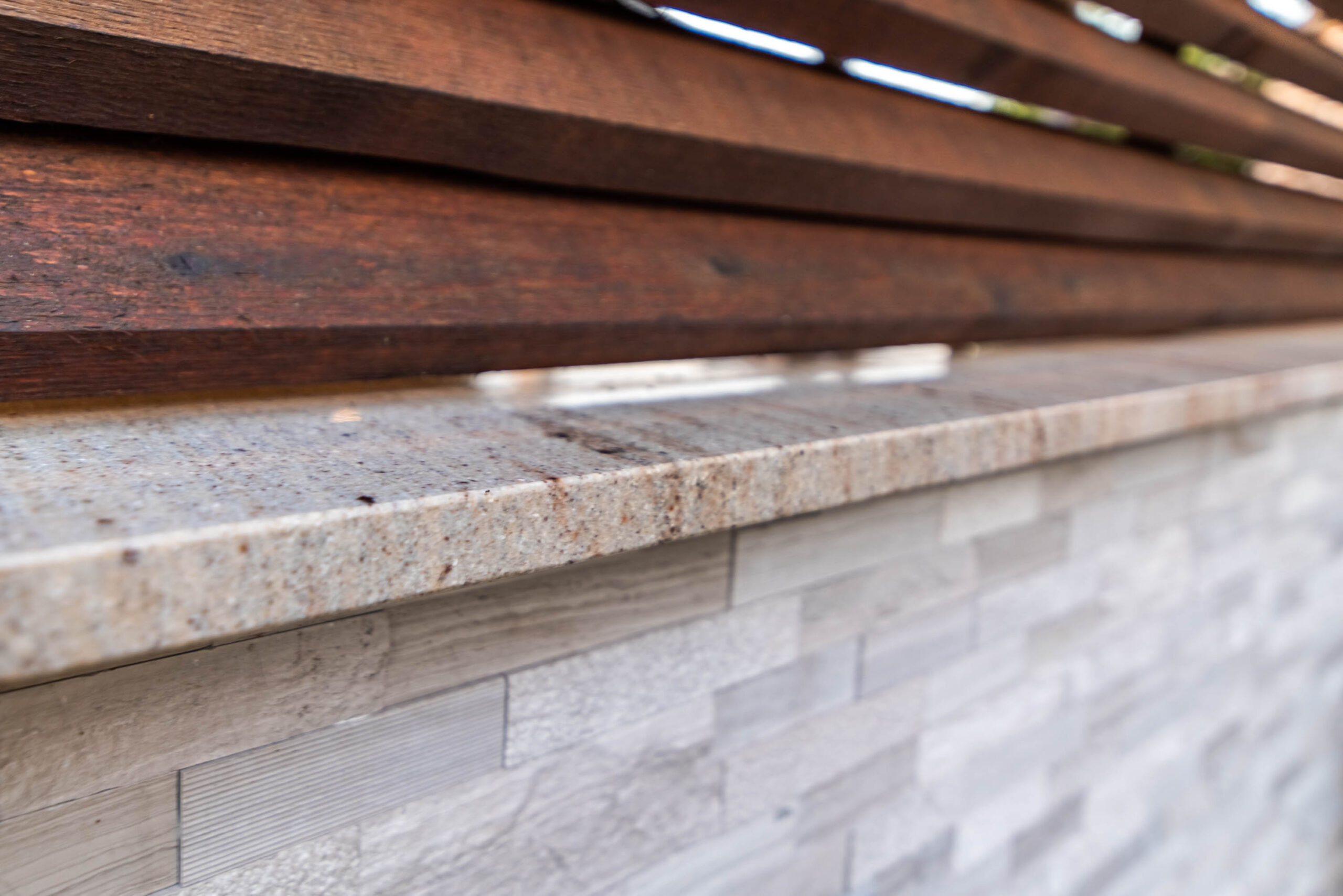 Behind the cooking areas, we installed a cedar sliding gate for our client to open while the grill and smoker are in use and to close for privacy during the evenings and shade from the west setting sun.