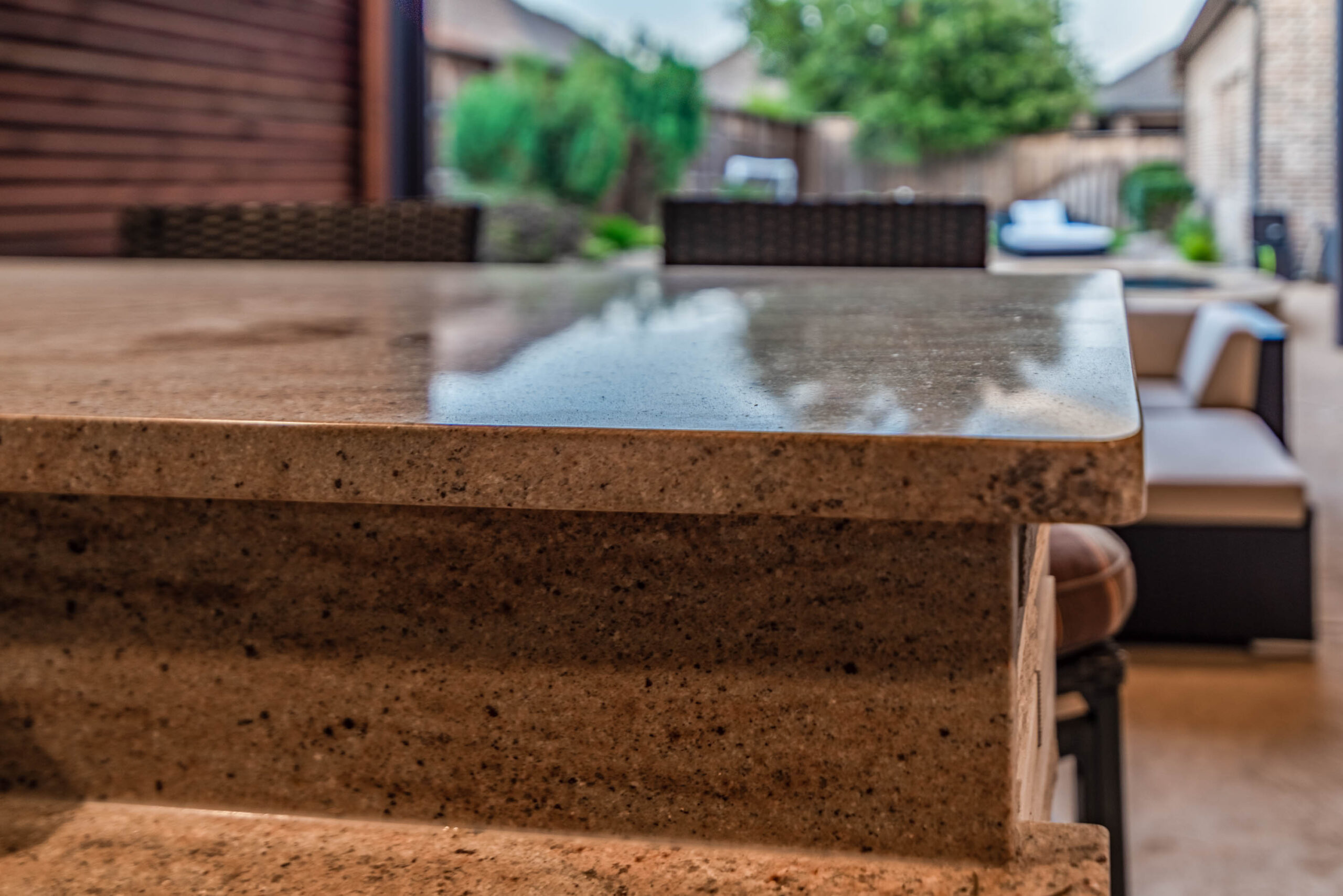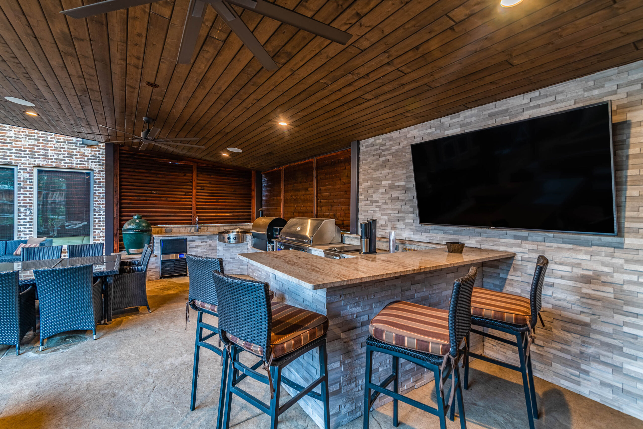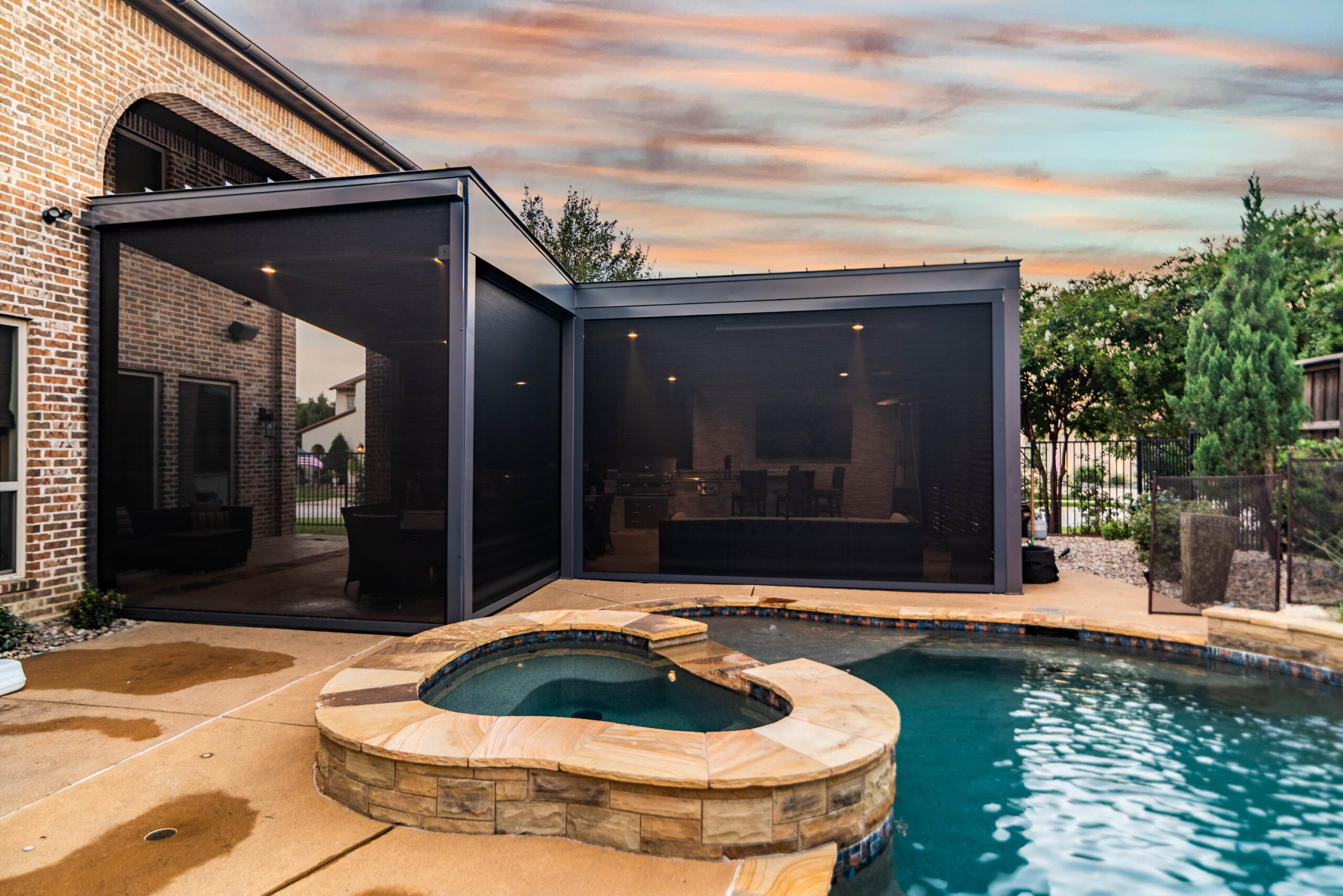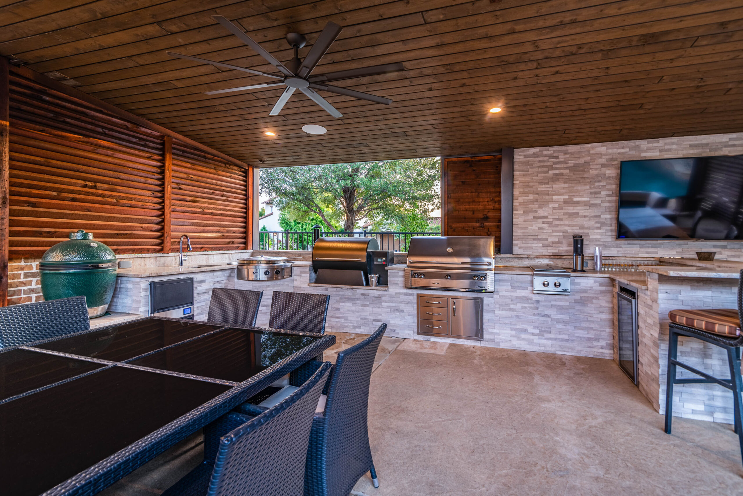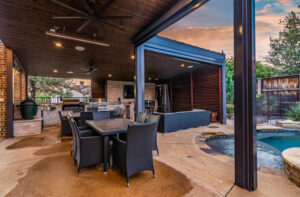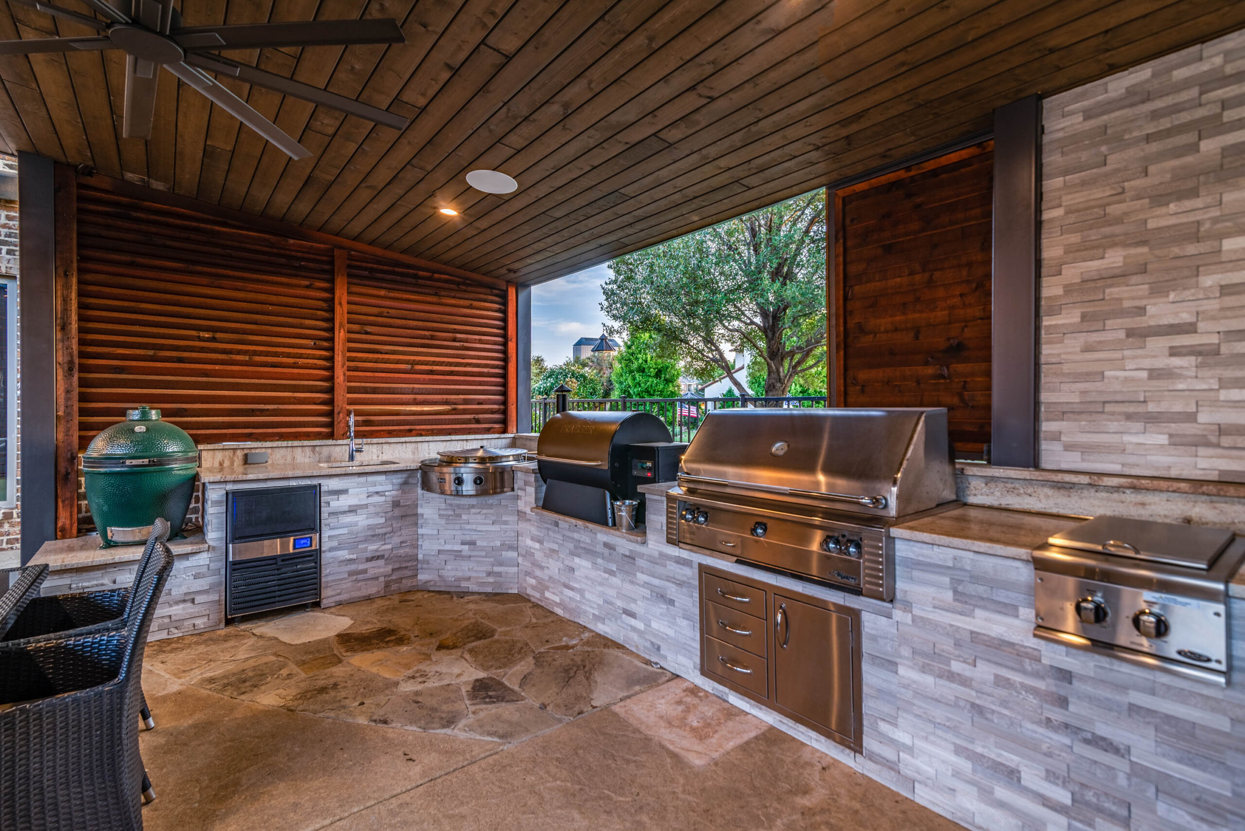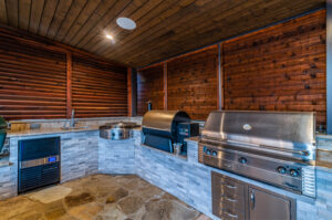 The patio cover is a sloped steel frame with a standing seam metal roof. The underside of the patio cover features pre-stain tongue and groove pine finish. The installed heaters and screens allow year-round comfort and accessibility to the patio. We welded the cooking area on-site with stacked stone and a granite top. Our client selected a hibachi, grill, smoker, and side burners for cooking—all the bells and whistles to complete this outdoor kitchen.