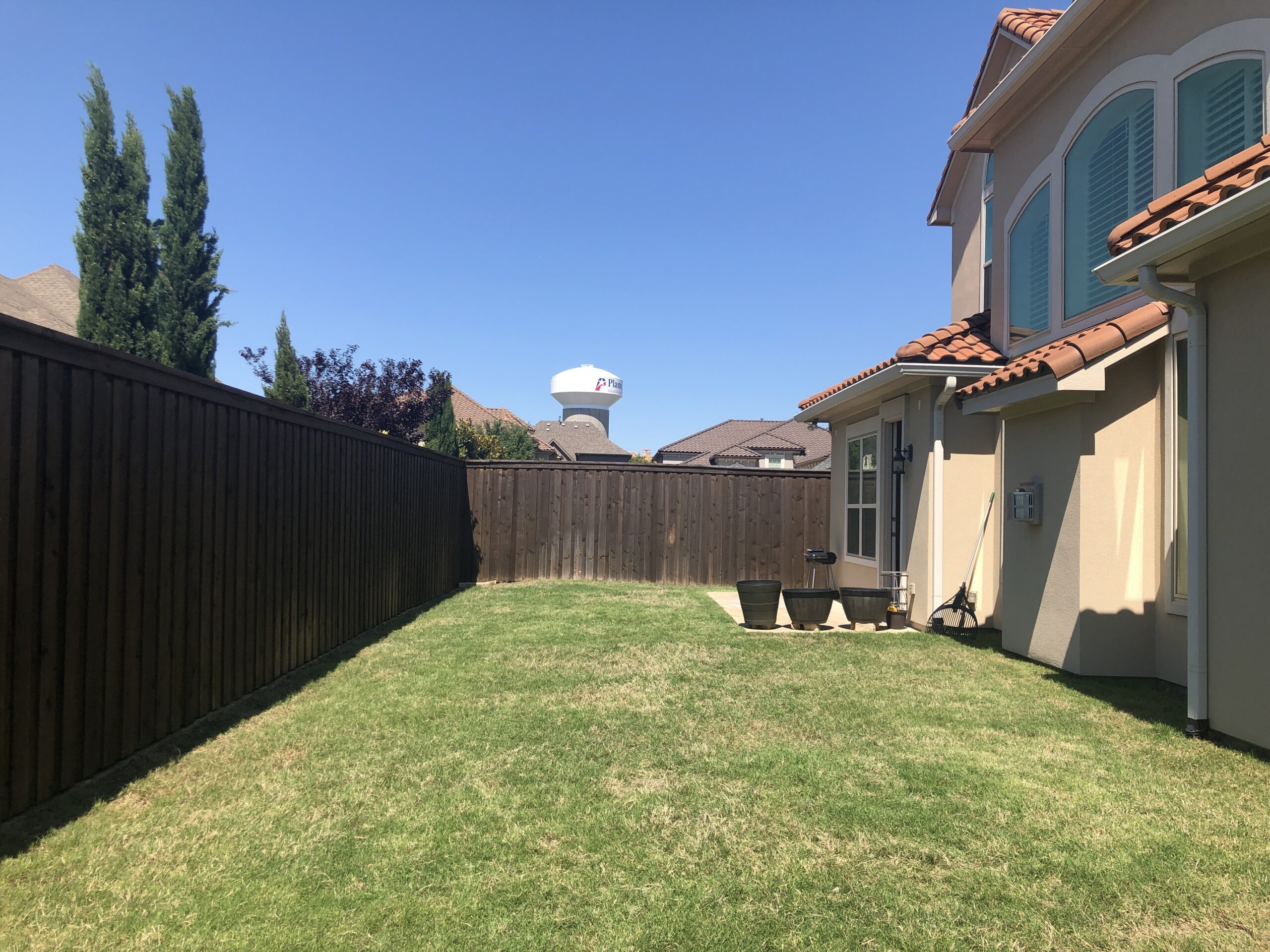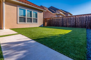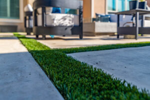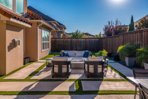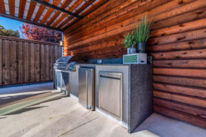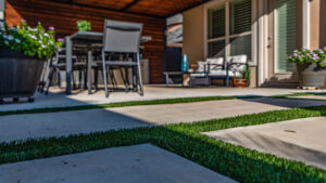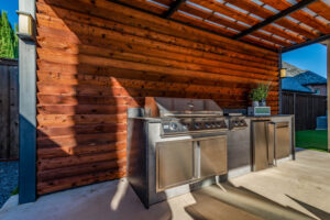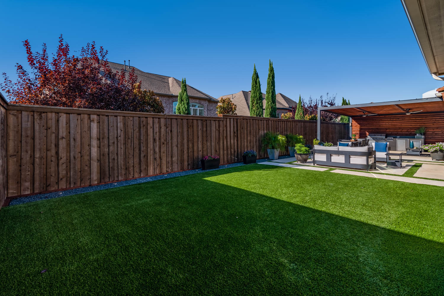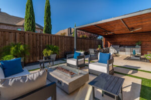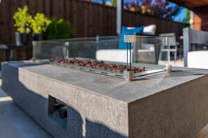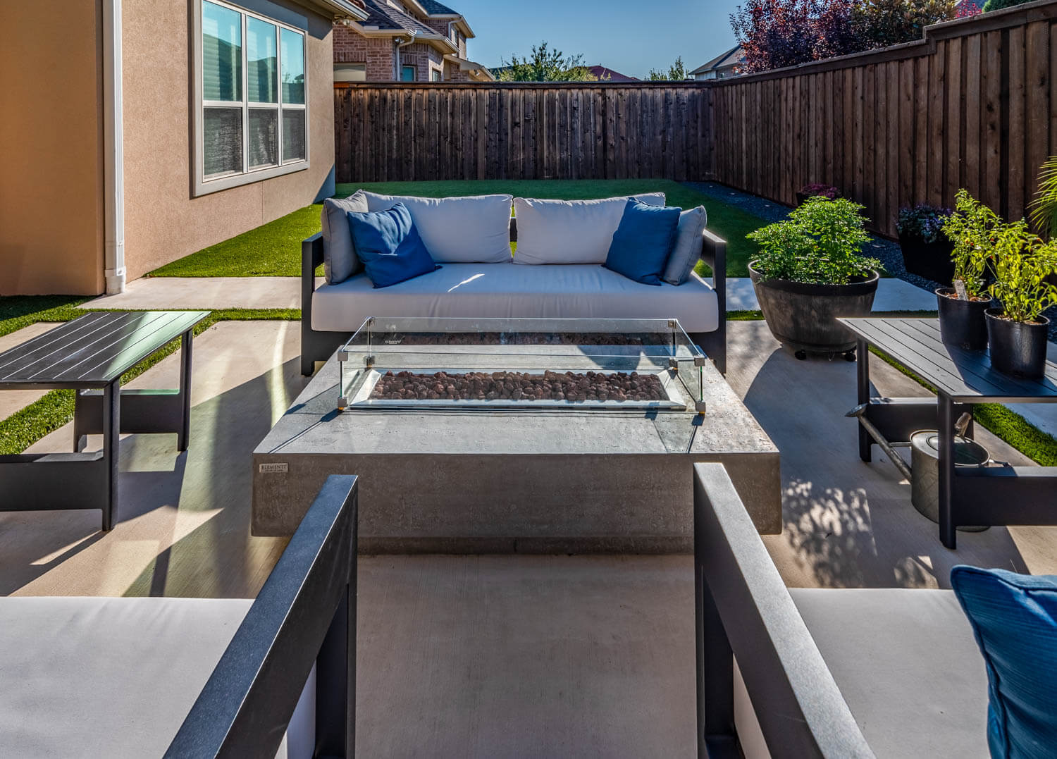 The concrete is a simple broom finish concrete with color added and sealed to give a clean look. The cooking area has stacked stone panels and a granite waterfall edge to complete the modern look. The privacy wall behind gives shade in the late afternoons and evenings so they can enjoy dinner outside. Beyond the patio we added concrete pads a gas fire pit with artificial turf added to give the kids a space to play.