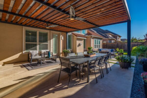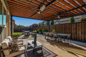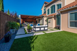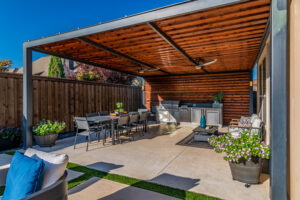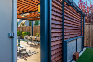 These clients needed shade. Without an existing patio cover, they had no way to enjoy their backyard because of the west setting sun. We added a modern steel pergola, cedar slats and a heavy duty cover on top from Regal Plastics to allow sun and light to penetrate but keep the rain away.