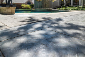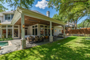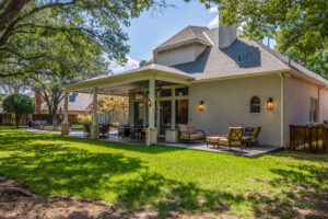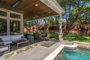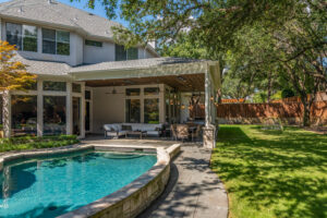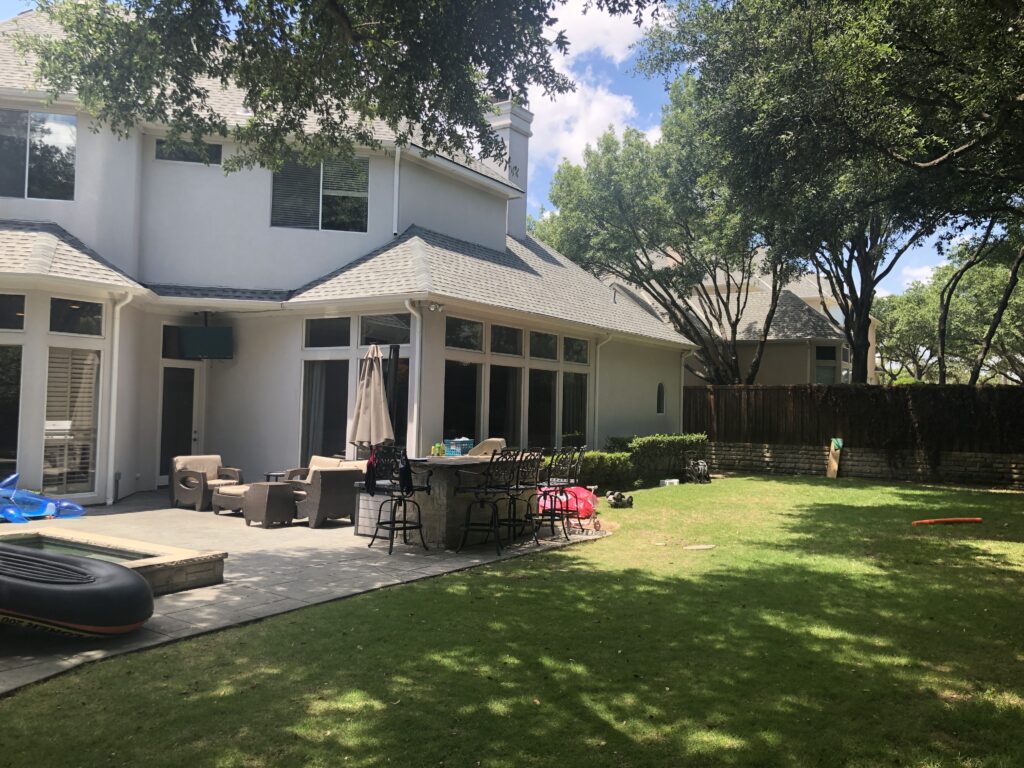 The clients here needed more patio space. Their existing grilling area shut them off to the backyard and was a feature they weren’t using. So, we removed it, added new stamped concrete in similar color and pattern to their existing pool deck, and wrapped the patio cover around the house. This gives them plenty of space for seating as well as recreation for the kids.