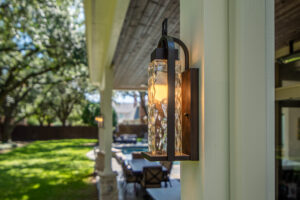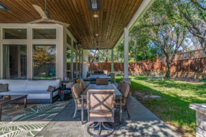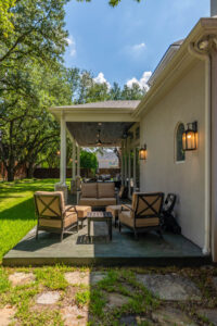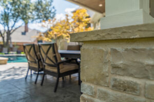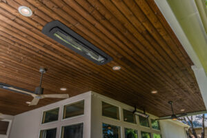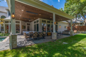 The ceiling is a pre-stained tongue and groove pine with ceiling fans, recessed cans, and electric heaters. We used extra stone on site to build stone pedestals on the columns and added an uncovered seating area with coach lights along the far side of the home. Plenty of spaces here to entertain in a variety of ways!